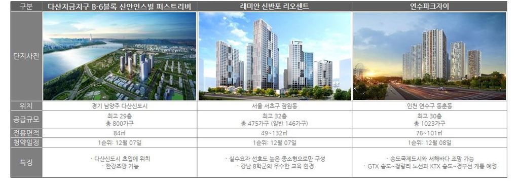 [아시아경제 주상돈 기자] 3일 부동산전문리서치업체 리얼투데이에 따르면 12월 둘째주에는 22곳·1만1264가구(공공분양 등 포함)가 청약접수를 받는다. 당첨자발표는 38곳, 계약은 8곳에서 진행된다.앞선 이번 주 청약에선 서울 송파구 '잠실 올림픽 아이파크'는 34.49대 1, 서울 성북구 '래미안 아트리치'는 5.03대 1, 서울 종로구 '경희궁 롯데캐슬' 43.36대 1 등을 기록했다. 대책 영향권에서 벗어난 지역에서 분양된 경남 밀양시 'e편한세상 밀양강'은 15.39대 1, 대구 수성구 '만촌 삼정그린코아 에듀파크'는 89.37대 1 등의 평균 경쟁률을 기록했다.우선 오는 7일 신안은 경기 남양주 다산신도시에 짓는 '다산지금지구 B-6블록 신안인스빌 퍼스트리버'의 청약접수를 받을 예정이다. 단지는 지하 2층~지상 29층, 8개동, 전용면적 84㎡, 총 800가구로 구성된다. 다산신도시 초입에 위치해 지구내에서 한강접근성 및 서울접근성이 가장 우수하다고 평가받고 있다. 가구에 따라 한강조망도 가능하다. 단지 서측으로 근린공원이 맞붙어 있다.같은 날 삼성물산은 서울 서초구 잠원동 52번지 일원에 짓는 '래미안 신반포 리오센트'의 청약접수를 받을 예정이다. 단지는 지하 3층~지상 32층, 6개동, 전용 49~132㎡, 총 475가구 규모다. 이 중 전용 59~84㎡, 146가구가 일반에 분양된다. 일반분양 분의 전용면적 별 가구 수는 ▲59㎡A 10가구 ▲59㎡B 18가구 ▲84㎡A 59가구 ▲84㎡B 28가구 ▲84㎡C 31가구로 중소형으로만 구성됐다.8일 GS건설은 인천 연수구 동춘동 동춘1도시개발사업지구 7블록에 공급하는 '연수파크자이'의 청약접수를 받는다. 단지는 지하 2층~지상 30층, 9개동, 전용 76~101㎡, 총 1023가구 규모로 구성된다. 전용 76㎡의 틈새평형부터 최상층의 실속형 펜트하우스까지 다양한 평형 구성으로 수요자의 입맛에 맞는 선택이 가능하며, 선호도가 높은 전용 84㎡ 이하의 중소형이 90%를 차지한다. 견본주택은 7곳에서 문을 연다. 9일 대우건설은 경기도 시흥시 대야동 418-21번지 일원에 '시흥 센트럴 푸르지오'의 견본주택을 개관할 예정이다. 단지는 지하 4층~지상 49층, 10개동, 아파트 전용 59~106㎡, 오피스텔 전용 23~49㎡, 총 2253가구(아파트 2003가구, 오피스텔 250실)로 구성된다. 아파트 분양가의 경우 1100만원대로 중도금 이자후불제가 적용되며, 오피스텔은 600만대 초반에 중도금 무이자가 적용될 예정이다. 주상돈 기자 don@asiae.co.kr<ⓒ세계를 보는 창 경제를 보는 눈, 아시아경제(www.asiae.co.kr) 무단전재 배포금지>