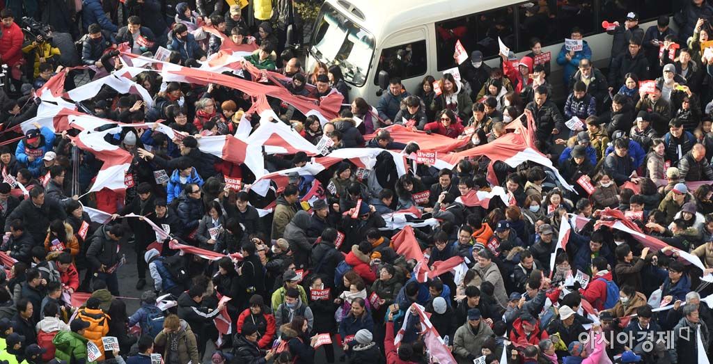 [아시아경제 백소아 기자] 3일 서울 영등포구 새누리당사 앞에서 열린 박근혜 퇴진! 새누리당 해체! 국정농단 공범 새누리당 규탄 시민대회에서 시민들이 새누리당 깃발을 찢는 퍼포먼스를 하고 있다.백소아 기자 sharp2046@asiae.co.kr<ⓒ세계를 보는 창 경제를 보는 눈, 아시아경제(www.asiae.co.kr) 무단전재 배포금지>