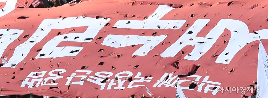 [아시아경제 백소아 기자] 3일 서울 영등포구 새누리당사 앞에서 열린 박근혜 퇴진! 새누리당 해체! 국정농단 공범 새누리당 규탄 시민대회에서 시민들이 새누리당 깃발을 찢는 퍼포먼스를 하고 있다. 백소아 기자 sharp2046@asiae.co.kr<ⓒ세계를 보는 창 경제를 보는 눈, 아시아경제(www.asiae.co.kr) 무단전재 배포금지>