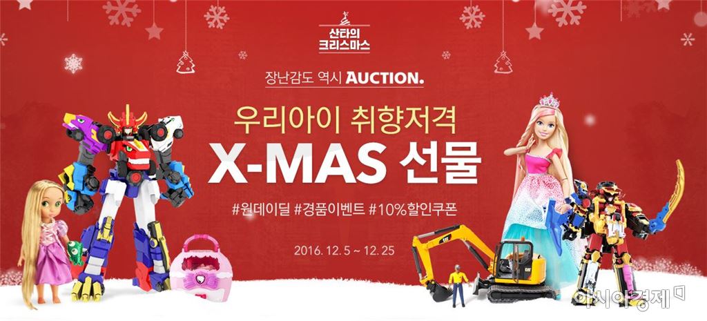 [아시아경제 김현정 기자] 온라인마켓플레이스 옥션이 크리스마스를 맞아 이달 25일까지 '우리아이 취향저격 X-MAS 선물' 프로모션을 열고, 인기 브랜드의 장난감과 아동용 완구 등을 최대 50% 할인된 가격에 선보인다고 5일 밝혔다.'X-마스 원데이 스페셜 딜' 코너에서는 인기 장난감을 하루에 한 개씩 선정해 특가에 판매한다. 5일에는 디즈니 애니메이터 베이비돌(2만9900원 부터)을 39% 할인 판매하고, 6일에는 베이블레이드버스트 B-62를 할인 가격에 구매할 수 있다. 제품 한 개를 구입하면 한 개를 더 주는 '1+1 럭키 딜' 코너도 마련한다. 손오공 터닝메카드W시리즈(5만7900원)와 피셔프라이스 뉴러닝홈·2종사은품(10만원 대) 등 인기 품목들을 한정 수량으로 선보인다. TV에 방영된 캐릭터 상품을 한 데 모아 판매하는 'TV속 바로 그 상품! 브랜드 딜' 코너에서는 '또봇애슬론 마그마식스(8만9000원)', '파워배틀 와치카 시리즈(1만2900원)' 등 브랜드(영실업·미미월드·토이트론·레고 등)의 장난감을 할인 판매한다. 이 밖에도 해외직구상품으로 인기 있는 '디즈니 베이비돌·스텝2 주방놀이'를 한정수량으로 온라인 최저가 수준으로 선보인다.구매 고객을 위한 풍성한 경품 이벤트도 마련됐다. 장난감 구매 후 응모자에 한해 1등에게는 다이슨 청소기(5명), 2등 에버랜드 자유이용권(1인2매, 10명), 3등 빕스 샐러드바 이용권(1인2매, 30명)이 제공된다. 또 매일 1회 선착순 발급되는 X-MAS 장난감 전용 10% 쿠폰과 전체 카테고리 10% 쿠폰도 지급된다. 보다 자세한 행사 내용은 옥션에서 '장난감 크리스마스 프로모션'을 검색하면 확인 가능하다.백민석 옥션 마트실장은 "이번 프로모션에서는 11월말까지도 오프라인 매장에서 공급이 어려웠던 인기만화 다이노코어 로봇시리즈를 단독으로 물량 확보해 준비했다"며 "1년 중 장난감 사기 좋은 날이라는 테마에 맞춰 옥션에서는 크리스마스 특가 세일을 마련했다"고 말했다.김현정 기자 alphag@asiae.co.kr<ⓒ세계를 보는 창 경제를 보는 눈, 아시아경제(www.asiae.co.kr) 무단전재 배포금지>