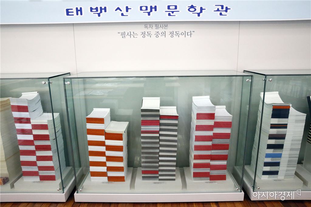 "보성군 공직자가 릴레이로 참여한 필사본도 전시" [아시아경제 노해섭 기자]보성군 태백산맥문학관에서 오는 12월 10일 2층 문학사랑방에서 소설 태백산맥 필사본 기증행사와 전시회를 갖는다. 이날 행사는 이용부 군수와 조정래 작가 부부, 송영석 해냄출판사 대표, 기증독자 및 가족들이 참석하여 필사독자에 대한 감사패 수여와 필사본 전시회 관람 등으로 진행될 계획이다. 소설 태백산맥은 전10권으로 그동안 필사독자들로부터 기증받은 필사본 수는 총 24점이다. 이들 중 21점은 개인이며, 나머지 3점은 조정래사랑 다음카페회원, 벌교읍 태백산맥깊이읽기 독서모임, 최근 이용부 보성군수, 강복수 군의회 의장 등을 비롯한 보성군 공직자들이 함께한 것이다. 특히 보성군 공직자가 함께한 필사릴레이는 지난 8월부터 10월말까지 468명의 공직자들이 16,500여매의 원고지에 전권을 필사하여 지역문화 자원 활성화에 동참했다. 이번 행사를 진행하기 까지는 기존에 작가의 방으로 활용되던 곳을 필사본 기증독자를 위해 조정래 작가가 흔쾌히 내주었으며 관광객들에게 다양한 문화서비스 제공을 위한 것으로 지난 7월부터 약 3개월간 리모델링 공사를 거쳐 국내 유일한 필사본 전시실을 새롭게 마련했다. 당초 작가를 위한 공간이 독자들을 위한 공간으로 바뀌어 영구적으로 전시할 것이며, 독자들이 제각각 삶의 의미를 두고 필사한 원고지와 기증독자들의 사연이 숨어 있는 다양한 노트는 관람객들에게 또 다른 감흥을 일으킬 수 있는 전시물이 될 것으로 기대된다. 올해 소설 태백산맥은 1986년 10월 5일 초판 발간 후 30주년을 맞이하였으며, 청소년 대상 태백산맥이 출간된 뜻깊은 해이기도 하다. 한편 태백산맥문학관은 올해로 개관 8주년을 맞이하였으며, 전국 문학기행 1번지로 관광객들에게 꾸준한 사랑을 받고 있다.노해섭 기자 nogary@<ⓒ세계를 보는 창 경제를 보는 눈, 아시아경제(www.asiae.co.kr) 무단전재 배포금지>