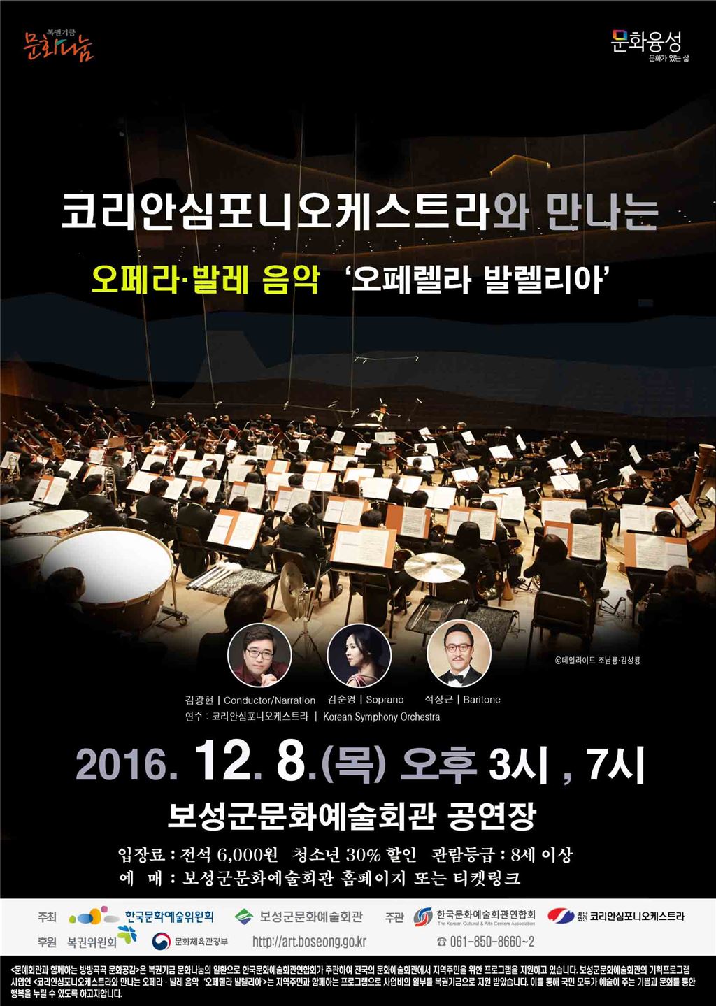 [아시아경제 노해섭 기자]보성군(군수 이용부)은 오는 8일 보성군문화예술회관 공연장에서 코리안심포니오케스트라와 만나는 오페라·발레 음악 ‘오페렐라 발렐리아’를 공연한다. 이번 공연은 한국문화예술위원회가 주최하고 한국문화예술회관연합회가 주관하며 기획재정부 복권위원회와 문화체육관광부가 후원하는 2016년 문예회관과 함께하는 방방곡곡 문화공감사업관련 국립예술단체 우수공연프로그램에 선정되어 공연료의 일부를 복권기금으로 지원받아 추진하는 클래식 공연이다. 코리안심포니오케스트라 공연은 국내 정상급 연주 활동을 하고 있는 코리안심포니오케스트라 단원(60여명)과 김광현 지휘와 해설로 쉽게 접하기 어려운 차이코프스키의 <백조의 호수>, <호두까기인형>, 베르디의 <라 트라비아타> 등 주요 아리아들로 구성된 오페라·발레 교향악을 직접 들어 볼 수 있는 오케스트라 공연이다. 성악가 김순영(소프라노)의 라 트라비아타 중 ‘에스트라노’와 유럽 오페라극장에서 활발히 활동하고 있는 성악가 석상근(바리톤)의 카르멘 중‘투우사의 노래’, 이중창‘축배의 노래’등을 선보일 예정이며, 연말을 맞이하여‘화이트 크리스마스’,‘크리스마스 페스티벌’등 캐롤 곡들도 만나 볼 수 있다. 창단 31주년을 맞이한 코리안심포니오케스트라는 국립오페라단, 국립발레단, 국립합창단 연주를 전담하는 전문오케스트라로 연간 100회 이상의 공연을 통하여 국내 교향악의 한 축을 담당하고 있으며, 국내외 정상급 아티스트와 함께 폭넓은 레퍼토리로 구성되는 정기연주회와 다양한 컨텐츠 개발을 통한 자체 기획시리즈인 '라이징스타, 토킹 위드 디 오케스트라' 등 관객들의 관심을 유발하여 폭넓은 관객층을 형성하는데 노력하는 국립예술단체이다. 군 관계자는 “예술의 전당 상주오케스트라인 코리안심포니오케스트라가 들려주는 오페라·발레·캐롤곡 등을 한자리에서 만나볼 수 있는 이번 공연이 최고의 연말 공연이 될 것이다”며 “지역주민 및 청소년, 그리고 가족단위 관람객들의 뜻깊은 시간이 될 이번 공연에 많은 분들이 함께하길 바란다”고 말했다. 공연일정은 12월 8일 목요일 오후 3시, 7시 공연하며 관람료는 1인 6,000원, 청소년 30% 할인한 4,200원이다. 예매는 보성군문화예술회관 홈페이지 또는 티켓링크에서 가능하며, 기타 사항은 보성군문화예술회관(061-850-8660~2)으로 문의하면 된다.노해섭 기자 nogary@ <ⓒ세계를 보는 창 경제를 보는 눈, 아시아경제(www.asiae.co.kr) 무단전재 배포금지>
