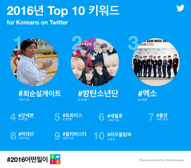 [아시아경제 한진주 기자] 올 한해 트위터에서 가장 많이 언급된 키워드는 최순실 게이트와 관련된 단어들이 차지했다.6일 트위터 코리아(Twitter Korea)는 2016년 한 해 동안 국내 이용자들이 생성한 트윗과 계정들을 분석해 각 분야별 키워드와 계정 순위를 발표했다.사회 분야에서는 ▲대통령 ▲최순실 ▲촛불집회가 나란히 1~3위를 차지했다. 해당 키워드들을 관통하는 ‘최순실 게이트’ 이슈는 지난 9월경부터 대화량이 급증하면서 올 한해 있었던 어떤 이슈들보다 많은 트윗을 만들어 냈다. 최근 2개월간 1~3위 3개 키워드를 직접적으로 언급한 트윗만 1800만개에 달했다.사회 분야 4위는 ‘세월호’로 사건 해결에 대한 관심과 추모 열기가 여전히 뜨거움을 증명했다. 이밖에도 20대 총선과 미국 대선 등 국내외 정치권 이슈들이 그 뒤를 이었다. 리우 올림픽은 10위에 올랐다.트위터 올해의 탑10 키워드