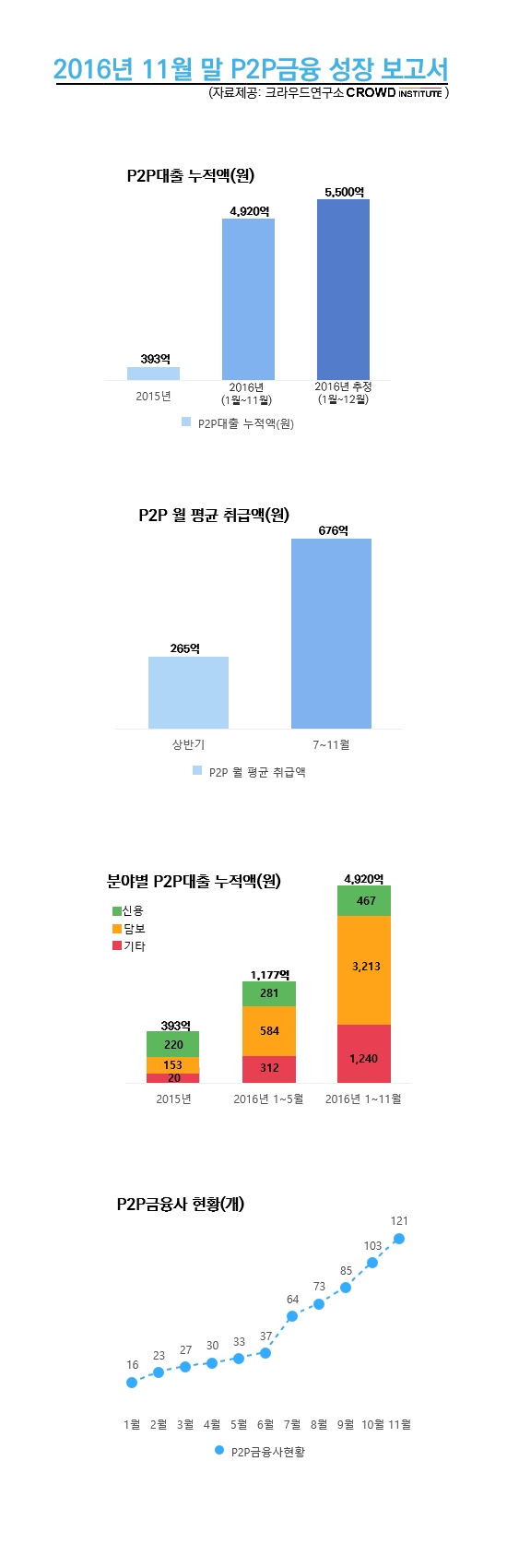 크라우드연구소 11월 P2P 금융 성장 보고서…업체수 120개 돌파·신생 업체, 경영 어려움 가속화