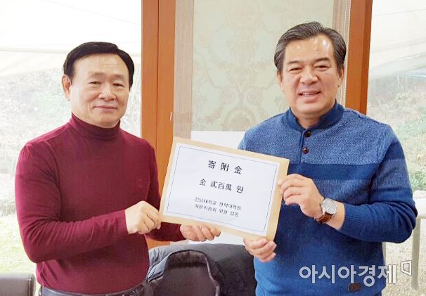 전남대학교 정책대학원 자문위원회(위원장 윤남식) 회원 20명이 겸면 죽산마을을 방문해 지역의 어려운 이웃을 위해 써 달라며 불우이웃돕기 성금 200만원을 유근기 곡성군수(오른쪽)에게 기탁했다.