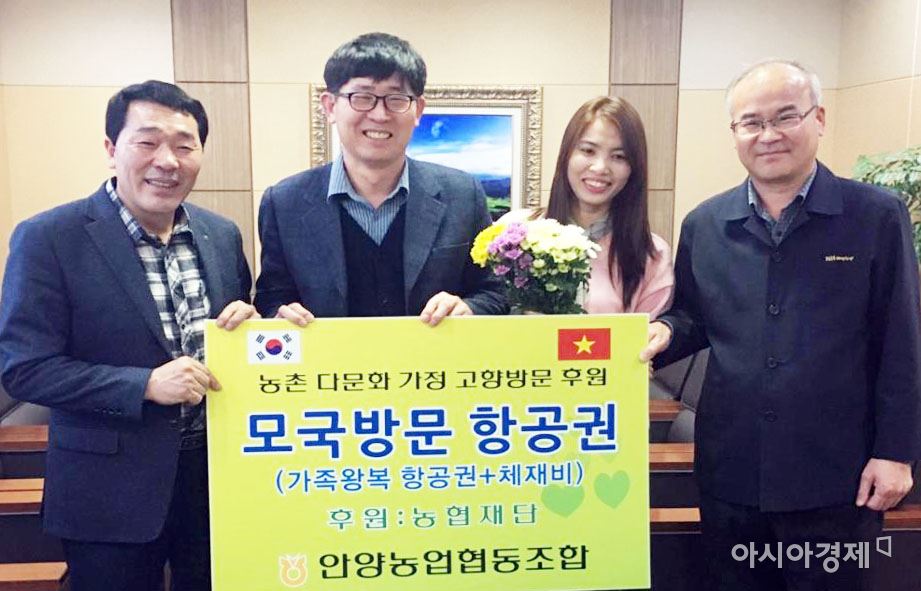 "다문화가정 가족왕복 항공권, 체재비, 여행자보험 가입비용 지원"[아시아경제 노해섭 기자]장흥군 안양농협(김영중 조합장)이 농촌지역 다문화 가정의 고향방문을 후원하고 나서 화제가 되고 있다.지난 1일 안양농협에서는 지역의 농촌 조합원인 결혼이민자 부부와 그 자녀가 베트남을 왕복할 수 있는 항공권과 체재비 및 여행자보험 가입비용 일체를 지원했다.이번 후원은 농업인 인구가 감소하고 있는 안타까운 농촌현실 속에서도 농촌을 지키고 있는 결혼이주여성의 안정적인 정착을 위해 마련됐다.또한 다문화 자녀들이 열심히 학업에 매진하고 꿈과 희망을 갖고 자라나기를 바라는 뜻에서 (재)농협재단의 협찬을 받아 추진됐다.이번 후원의 주인공이 된 김항종 부부는 “가족 모두가 베트남을 방문할 수 있도록 후원해준 농협에 감사드린다”며 “보다 열심히 사는 모습으로 지역사회에 보답하겠다”고 말했다.안양농협 김영중 조합장은 “앞으로도 지역 다문화가정을 위한 다양한 프로그램과 지원에 관심을 갖고 추진하겠다”고 말했다.노해섭 기자 nogary@<ⓒ세계를 보는 창 경제를 보는 눈, 아시아경제(www.asiae.co.kr) 무단전재 배포금지>