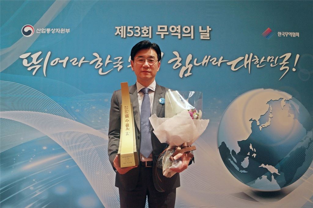 ㈜짐월드 박기영 대표가 무역의 날 ‘1천만불 수출의 탑’을 수상한 후 기념 촬영을 하고 있다.