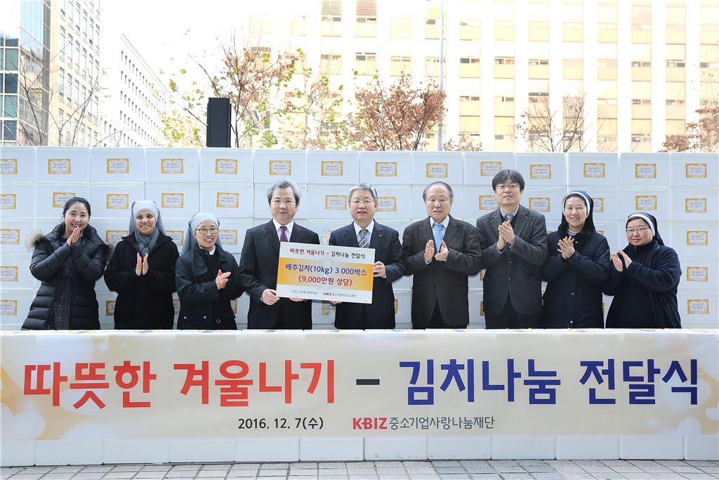 [아시아경제 정동훈 기자] 중소기업사랑나눔재단은 7일 서울 여의도 중소기업회관에서 소외된 이웃들에게 김치 1만 포기(약 9000만원 상당)를 지원하는 전달식을 개최했다.이번 전달식은 사랑나눔재단이 추진하고 있는 '따뜻한 겨울나기' 사업의 일환이다. 전국 각지의 복지기관 120여 곳에 김치 박스(10㎏) 3000개를 전달할 예정이다.120여개 복지기관을 대표해 전달식에 참석한 김택진 청해복지재단 이사는 "배춧값이 올라 김장 담기에 부담이 컸는데 이번 도움이 겨울을 나는데 큰 힘이 된다"고 밝혔다.유영호 중소기업사랑나눔재단 사무부총장은 "재단은 중소기업이 거둔 과실을 지역의 이웃들과 함께 나눔으로써 중소기업과 지역 간 상생의 나눔을 실천하고 있다"며 "중소기업이 십시일반으로 나누어준 소중한 재원을 통해 아름다운 세상을 만드는데 조금이나마 도움이 되도록 노력해 나갈 것"이라고 밝혔다.정동훈 기자 hoon2@asiae.co.kr<ⓒ세계를 보는 창 경제를 보는 눈, 아시아경제(www.asiae.co.kr) 무단전재 배포금지>