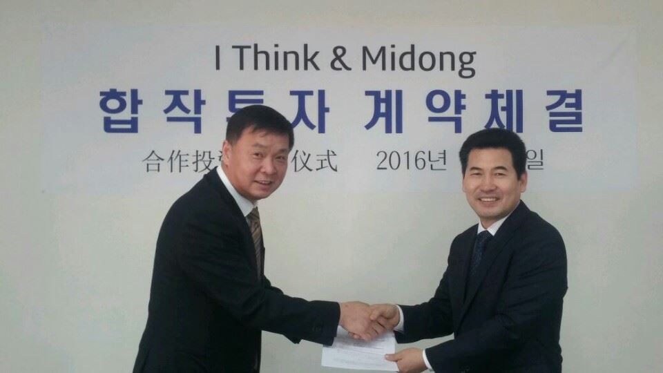김기열 미동앤씨네마 부사장(왼쪽)과 강명호 아이씽크코리아 총경리가 투자계약서에 사인 후 악수를 하고 있다.