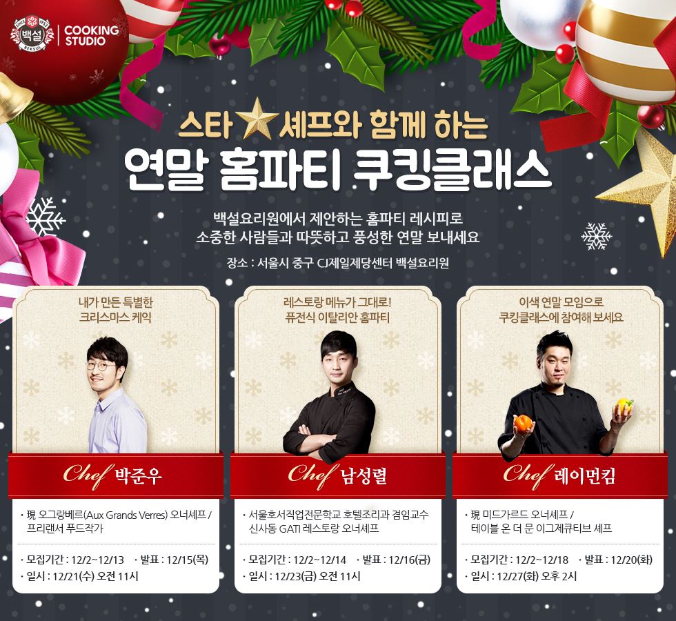 [아시아경제 이주현 기자]CJ제일제당 백설요리원이 스타셰프를 초청해 홈파티요리를 테마로 한 연말 쿠킹클래스 특강을 진행한다고 8일 밝혔다. 이번 쿠킹클래스는 계속되는 불황 속에서 외식보다는 집에서 근사한 요리를 즐기기 원하는 소비자를 대상으로 파티요리 노하우를 전수하기 위해 기획됐다. 오는 21일부터 27일까지 3회 진행되며, 최근 유명세를 타고 있는 스타셰프들이 강사로 참여해 가정간편식 제품들을 활용한 다양한 파티요리 레시피들을 선보일 예정이다. 21일은 박준우 세프가 강사로 나서 ‘내가 만드는 크리스마스 파티요리’를 주제로 ‘매시드 포테이토를 곁들인 미트로프’와 ‘크리스마스 통나무 케이크 크림 디저트’를 선보인다. 23일에는 ‘퓨전식 이탈리안 홈파티’를 주제로 남성렬 셰프가 ‘나물 페스토와 푸실리’와 ‘감귤로 채운 로스트 치킨’ 두 가지 메뉴를 소개한다. 20~30대 직장인들에게 참여 기회를 넓히기 위해 저녁시간 대 진행하는 수업도 마련했다. 오는 27일에는 레이먼킴 셰프가 ‘이색 연말 모임 쿠킹클래스’를 주제로 ‘훈연방식으로 만든 석화 그라탕’과 ‘블루치즈 소스를 곁들인 치킨 스테이크’ 만드는 법을 전수한다. 이주현 기자 jhjh13@asiae.co.kr<ⓒ세계를 보는 창 경제를 보는 눈, 아시아경제(www.asiae.co.kr) 무단전재 배포금지>