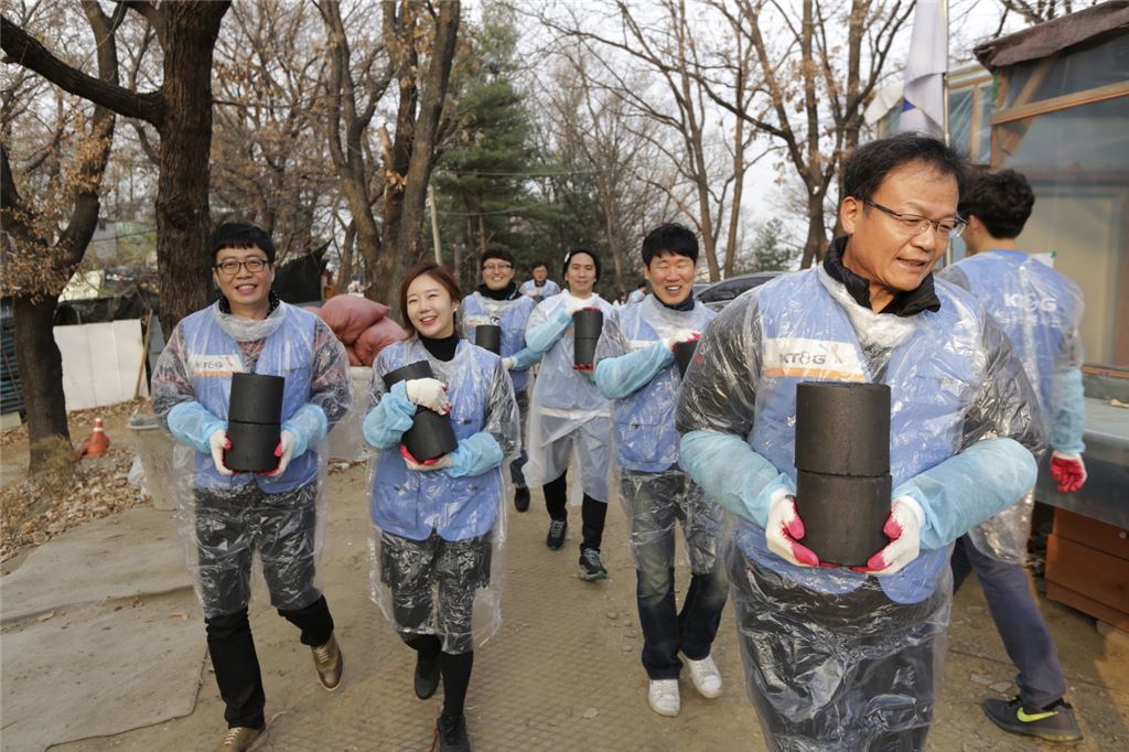 7일 백복인 KT&G 사장(사진 오른쪽에서 첫 번째)이 기업문화 혁신을 위한 상설기구 ‘상상실현위원회’ 소속 직원들과 함께 서울 강남구 개포동 달터마을에서 연탄 배달 봉사활동을 펼치는 모습.