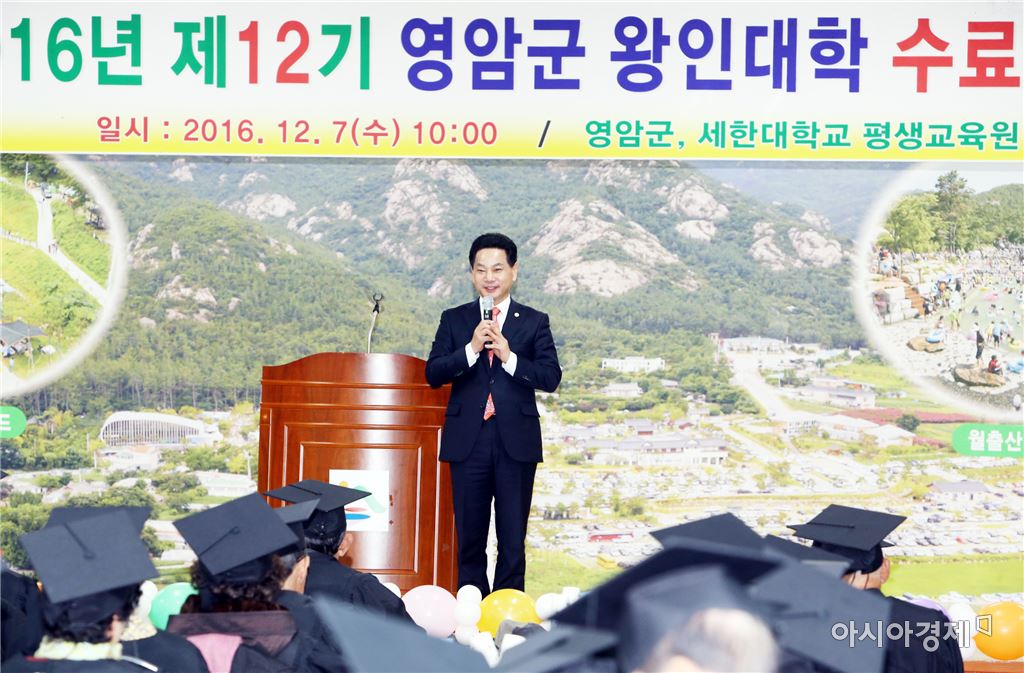 [아시아경제 노해섭 기자]제12기 영암군 왕인대학 수료식이 지난 7일 영암군 종합사회 복지관에서 전동평 군수, 세한대 정기영 평생교육 원장 등 기관사회 단체장과 읍면장 및 직원, 수료생, 가족 등 200여명이 참석한 가운데 성대하게 열렸다.이날 수료식에서는 60세 이상 어르신 입학생 118명 가운데 95명이 영예롭게 수료함으로써 2005년부터 2016년 현재까지 12년간 왕인대학 수료생은 1,468명이 배출됐다.식전행사로 제12기 영암군 왕인대학 수료식을 축하하기 위해 종합사회복지관 수강생들의 우리 춤 공연과 세한대학교 전통연희학과 학생들이 판굿과 북춤 그리고 판소리와 국악가요을, 태권도학과 학생들의 태권도 시범 등을 함께 선보여 왕인대학 학생들의 뜨거운 박수갈채를 받았다.이어진 수료식에서 학산면 용산리 김정자 어르신 등 20명이 전동평 군수로부터 개근상을 받았으며, 박규상 자치회장 등 3명이 세한대학교 평생교육 정기영 원장으로부터 세한대학교총장 공로상을 받아 수료생과 가족 그리고 해당 지역 읍면장과 직원들의 축하를 받았다.박규상 자치회장은 인사말을 통해 “왕인대학에 입학해서 많은 친구들을 알게 되어 기쁘고, 세한대학교 평생교육원 직원과 종합사회복지관 직원들의 따뜻하고 친절한 안내와 함께 유명 강사님들의 강의를 경청하고 노래교실 참여로 12기 왕인대학 학생들과 함께 웃을 수 있어 즐거웠다”며 “특히 현장학습으로 5월에 강진 가우도 출렁다리 및 진도타워 관람과 10월에는 장흥 국제통합의학박람회장에서 각종 의료기구 및 건강 맛사지 체험 등을 받아 좋았디"고 말했다. 또한 "노인들의 댄스공연을 관람 하면서 건강에 대해 다시 생각하게 하는 즐거운 시간이었다”고 덧븥였다.노해섭 기자 nogary@<ⓒ세계를 보는 창 경제를 보는 눈, 아시아경제(www.asiae.co.kr) 무단전재 배포금지>