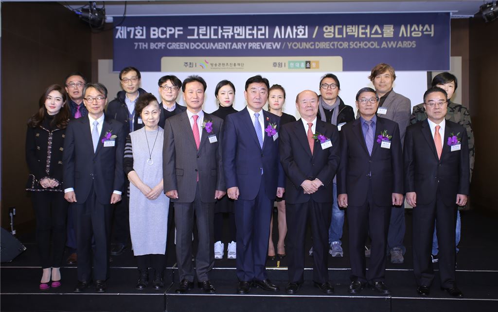 강찬석 현대홈쇼핑 대표(앞줄 왼쪽에서 네번째)가 지난 8일 오후 '제7회 그린다큐멘터리 공모전 수상작 시사회'가 끝난 후 기념 촬영을 하는 모습.
