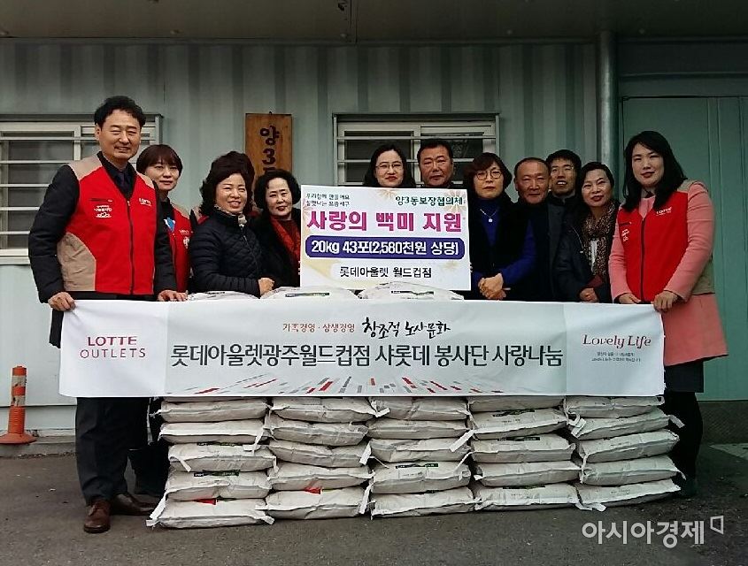 [아시아경제 문승용 기자] 롯데아울렛 광주월드컵점(점장 김태회)은 다사다난했던 올해를 마무리하고 희망찬 2017년을 기원하기 위해 12일 양3동 주민 센터에서 ‘사랑의쌀 나눔 행사’를 진행했다. 이날 사랑의쌀 나눔 행사 비용은 지난 7월부터 11월까지 월드컵점 전 직원이 ‘Lovely 행복나눔 저금통 갖기 운동’을 통해 모금된 성금을 기탁해 이뤄졌다. 월드컵점 임직원 일동은 ‘서구 양3동 한가족 쌀뒤지’에 쌀 20㎏들이 43포를 채워넣었다. 롯데아울렛 김태회점장은 “앞으로도 훈훈하고 정이 넘치는 지역사회 만들기에 앞장 서겠다”고 밝혔다. 김순자 양3동주민센터 동장은 어려운 이웃에게 사랑의 후원을 실천해 준 월드컵점에 감사드린다”고 말했다.문승용 기자 msynews@<ⓒ세계를 보는 창 경제를 보는 눈, 아시아경제(www.asiae.co.kr) 무단전재 배포금지>