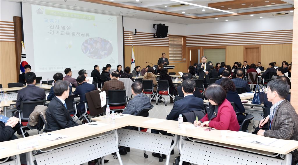 이재정 경기도교육감이 신임 학교장들과의 현장소통에서 인사말을 하고 있다.