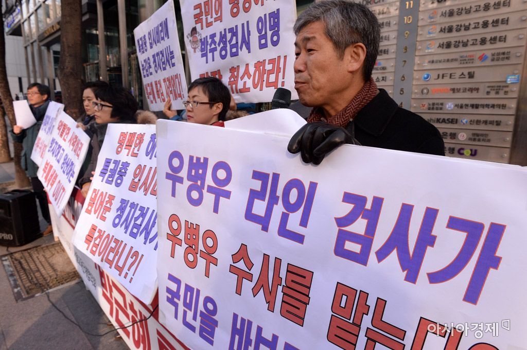 [아시아경제 문호남 인턴기자] 서울교육단체협의회 관계자들이 13일 서울 강남구 대치동에 마련된 특검 사무실 빌딩 앞에서 박주성 검사의 특검 제외를 촉구하는 기자회견을 열고 있다.문호남 인턴기자 munonam@asiae.co.kr<ⓒ세계를 보는 창 경제를 보는 눈, 아시아경제(www.asiae.co.kr) 무단전재 배포금지>