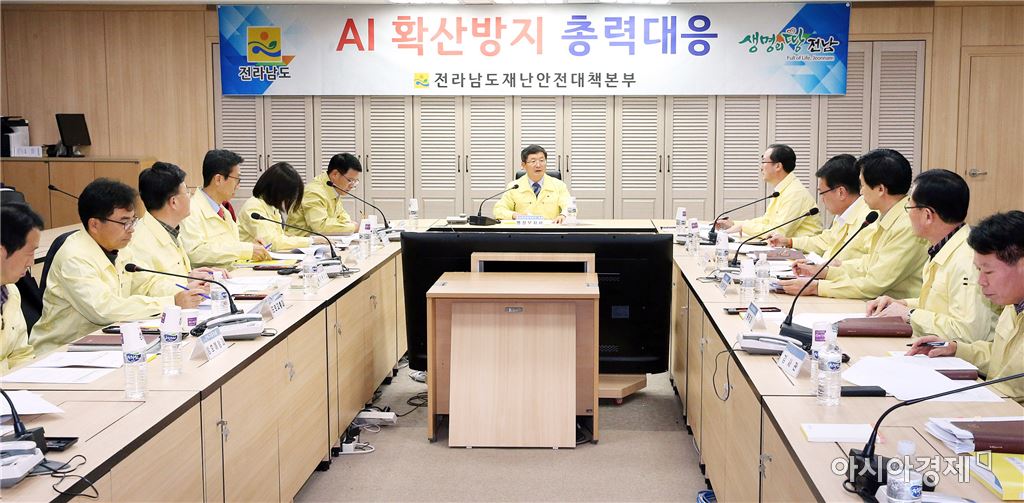 전라남도는 13일 오후 도청 재난안전상황실에서 김갑섭 행정부지사 주재로 ‘AI 확산방지 관련부서장 대책회의’를 개최하고, 행정력을 집중해 방역대책·인체감염 대책·매몰관련 환경정비 대책 등 AI 확산방지에 총력 대응키로 했다. 사진제공=전남도<br /> <br />