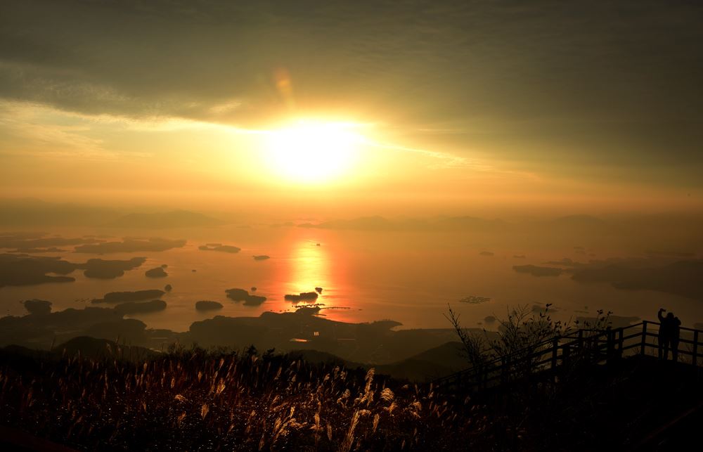 해가지고 나면 남해대교에 조명이 들어온다. 따스한 불빛을 품은 바다, 그리고 점점이 떠있는 섬들, 물살을 가르며 나아가는 크고 작은 배들이 정겹다. 하지만 이 바다는 거친 노량해협이다. 임진왜란 때 이순신 장군의 마지막 해전이 펼쳐졌던 곳이다. 조류가 거세게 흘러 바닷물이 소용돌이를 일으킨다. 큰 칼 옆에 차고 결전의 의지를 불사르는 장군의 모습이 멀리 남해대교와 겹친다.하동 진교방면으로 10여분 가면 일출명소다. 금오산(金鰲山)이다. '쇠 금(金)'에 '자라 오(鰲)'자를 쓰는 '금오산'은 경북 구미에도, 전남 여수에도 있다. 유명세로는 구미나 여수에 못 미치지만 풍경은 하동 금오산이 단연 으뜸이다. 금오산은 해발 849m. 해발 1000m를 훌쩍 넘는 연봉들이 물결치는 지리산에 안겨 있는 곳이라 이 정도 높이는 그리 대단치 않다. 하지만 바다를 끼고 있어 정작 정상에 서면 그 높이의 까마득함이 새삼스럽다. 자동차로 정상에 도착하면 남해바다를 향한 전망대가 있다. 이름이 해맞이 공원이니 일출 풍경은 두말하면 잔소리다. 금오산에서 내려다보는 비경은 단연 바다쪽이다. 지리산의 연봉들이 물결치는 북쪽도 좋지만, 그보다 남사면의 바다 쪽 풍경이 훨씬 더 매혹적이다. 바다의 풍경은 너무 멀지도, 너무 가깝지도 않다. 딱 아름답게 바라볼 그 만큼이다. 붉은 기운이 바다에서 불끈 솟아오른다. 겹겹이 둘러 처진 바다의 섬을 뚫고 힘찬 용틀임을 한다. 구례ㆍ하동=글 사진 조용준 여행전문기자 jun21@asiae.co.kr