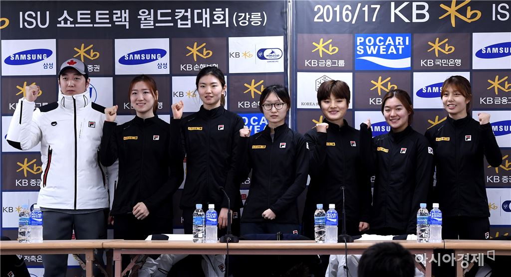 [강릉=아시아경제 김현민 기자] ISU 쇼트트랙 4차 월드컵대회 한국대표팀의 미디어데이가 14일 강원도 강릉 아이스아레나에서 열렸다. 여자대표팀 조재범 코치(왼쪽부터), 노도희, 심석희, 최민정, 김혜빈, 김지유, 김건희가 선전을 다짐하며 파이팅을 외치고 있다. 김현민 기자 kimhyun81@asiae.co.kr<ⓒ세계를 보는 창 경제를 보는 눈, 아시아경제(www.asiae.co.kr) 무단전재 배포금지>
