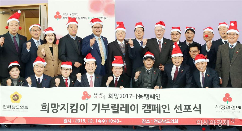 [아시아경제 노해섭 기자]‘희망 2017 나눔 캠페인, 희망지킴이 기부릴레이 선포식’이 14일 오전 전남도의회에서 열린 가운데 이낙연 전남지사, 이장석·권욱 부의장을 비롯한 도의원들이 기부함에 성금을 넣은 후 기념촬영하고 있다. 사진제공=전남도 <ⓒ세계를 보는 창 경제를 보는 눈, 아시아경제(www.asiae.co.kr) 무단전재 배포금지>