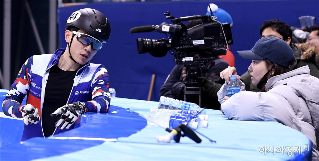 [강릉=아시아경제 김현민 기자]러시아 쇼트트랙 국가대표 빅토르 안(안현수)가 ISU 쇼트트랙 4차 월드컵대회을 이틀 앞둔 14일 강원도 강릉 아이스아레나에서 훈련을 했다. 잠깐의 휴식시간을 이용해 아내 우나리씨와 대화하고 있다. 김현민 기자 kimhyun81@asiae.co.kr<ⓒ세계를 보는 창 경제를 보는 눈, 아시아경제(www.asiae.co.kr) 무단전재 배포금지>