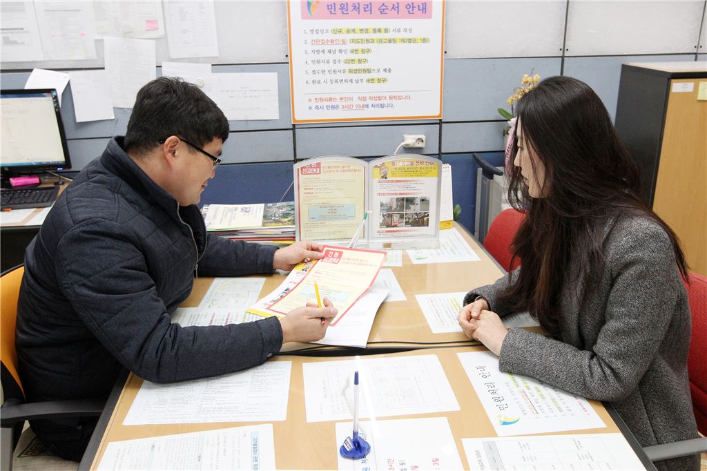 광명시가 지난달 도입한 불법광고물 원스톱서비스를 이용하기 위해 상담창구를 찾은 시민이 담당 공무원과 상담을 진행하고 있다.