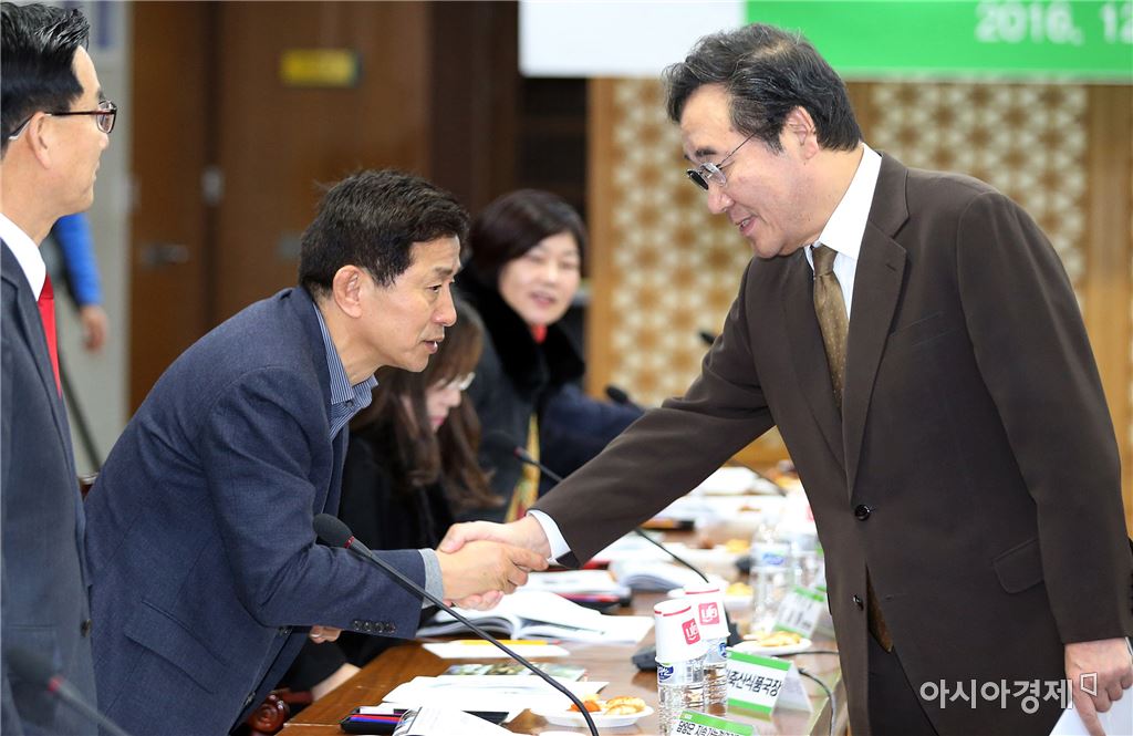 ‘한국전통정원 활성화 방안 연구용역 최종보고회’가 15일 도청 서재필실에서 열린 가운데 이낙연 전남지사가 참석자들과 인사하고 있다. 분야별 전문가와 관계 공무원 등 24명이 인문과 전통이 융합된 전통정원 활성화 방안과 신규 남도정원 조성 방안 등을 보고하고 논의했다. 사진제공=전남도