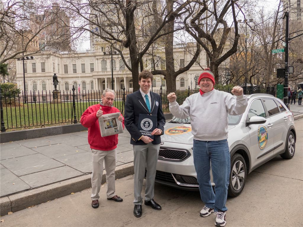 기아차 니로가 최고 연비로 기네스 세계 신기록 인증서를 수여 받는 장면. 오른쪽부터 운전자 웨인 거디스, 기네스 월드레코드 관계자, 공동운전자 로버트 윙어<br />