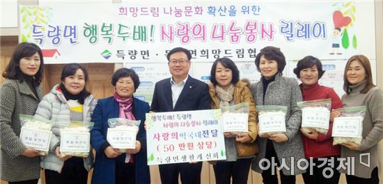 "14개 기관단체 1,700만원 상당 물품 890세대 지원" [아시아경제 노해섭 기자]보성군 득량면(면장 박성주)은 지난 9월부터 복지사각지대 해소를 위해 맞춤형 복지시책으로 희망드림 나눔문화 확산을 위한 행복두배! 사랑의 나눔봉사 릴레이를 적극 추진하고 있다. 지난 20일 연말연시를 맞아 기관단체협의회, 득량면 이장단협의회, 여성자원봉사회, 새마을지도자회, 생활개선회, 의용소방대, 보성특수농산, 보성푸르메농장, 산뜨락농원, 예당합동종합중기를 비롯한 14개 기관단체가 참여하여 소고기, 돼지고기, 사랑의 쌀, 오리알, 그린키위, 김, 장조림, 라면, 김장김치, 떡국용 떡 등 13개 품목 1,700만원 상당의 물품을 890세대에 지원했다. 득량면이장단협의회 조익성 회장은 “올해는 사랑의 나눔봉사 릴레이를 추진하면서 많은 주민들을 돕고 있어‘나누면 행복이 두배’라는 말이 실감난다”고 말했다. 박성주 면장은 “소외받는 지역민이 없도록 행복두배! 사랑의 나눔봉사 릴레이를 내년에도 지속적으로 전개하여 면민 모두가 행복한 복지득량을 만들어 가겠다”고 다짐했다. 한편 득량면은 노인인구가 많은 지역 여건을 감안해 어르신들의 휴식공간이자 소통의 장으로 이용되고 있는 경로당 맞춤형 복지서비스 일환으로 경로당 이용어르신들을 대상으로 화재예방, 노인학대예방, 심폐소생술 등 응급구조 대처요령 등을 교육했다.또한 매월 셋째주를 경로당 방문주간으로 지정하고 복지이장과 자원봉사자들이 안부를 살피고 의용소방대원들은 51개 경로당의 전기, 가스, 수도시설 등을 점검하는 등 월동대비 봉사활동을 전개했다.노해섭 기자 nogary@<ⓒ세계를 보는 창 경제를 보는 눈, 아시아경제(www.asiae.co.kr) 무단전재 배포금지>