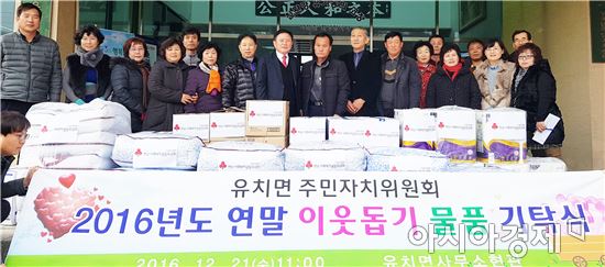 "커피, 차, 화장지, 겨울이불 등 경로당 생활용품 기탁"[아시아경제 노해섭 ]장흥군 유치면 주민자치위원회(위원장 안방오)는 지난 21일 유치면사무소에서 겨울철 지역 경로당에 필요한 커피, 차, 화장지, 겨울이불 등을 기탁했다.주민자치위원 22명이 참여한 이날 기탁은 겨울철을 맞아 어르신들이 경로당에서 지내는 시간이 많아지면서 필요한 생활용품을 지원하기 위해 마련됐다.안방오 주민자치위원장은 “작은 정성이지만 지역 어르신들이 겨울을 나는데 조금이라도 보탬이 되기를 바란다”며 “앞으로도 더불어 살아가는 유치면을 위해 지속적인 노력을 기울이겠다”고 말했다.김한석 유치면장은 “이 같은 나눔은 통해 이웃 사랑을 실천해주심에 감사드리며, 기부된 물품을 경로당에 잘 전달하겠다”고 답했다.유치면 주민자치위원회는 어르신 영화보는 날 운영, 댐주변 환경정화 자원봉사활동 등 지역적 특성에 맞는 사업을 운영하며 지역주민들로부터 호평을 받고 있다.노해섭 기자 nogary@ <ⓒ세계를 보는 창 경제를 보는 눈, 아시아경제(www.asiae.co.kr) 무단전재 배포금지>