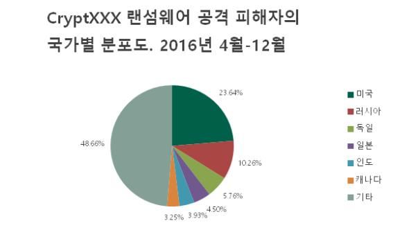 [아시아경제 이민우 기자] 카스퍼스키랩은 '크립트XXX(CryptXXX)' 랜섬웨어에 감염된 파일을 복구하는 '라노디크립터(RannohDecryptor) 도구'를 22일 발표했다. 랜섬웨어는 사용자의 컴퓨터에 있는 파일들을 암호화시킨 후 추적이 불가능한 전자화폐인 '비트코인'으로 결제를 해야만 암호화를 해제해주는 악성코드다. 해커들이 직접적으로 금전수익을 올릴 수 있는 수단이기 때문에 점차 피해가 늘어나고 있다.'크립트XXX'는 지난 4월 이후 전 세계를 대상으로 수십만명의 피해자를 발생시킨 것으로 추정되는 랜섬웨어다. 특히 감염 파일을 완벽히 복구하는 것이 불가능한 것으로 알려져 악명을 떨치고 있다. 실제 카스퍼스키랩 제품을 사용한 피해자만 전 세계적으로 8만명 이상인 것으로 나타났다. 이 중 절반 이상이 미국, 러시아, 독일, 일본, 인도, 캐나다에 분포해 있었다.
