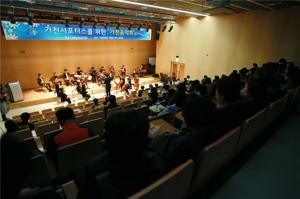 가천대가 '가천서포터스'를 위한 음악회를 개최했다. 음악회에 참석한 서포터스들이 모짜르트의 피가로의 결혼 등을 듣고 있다.