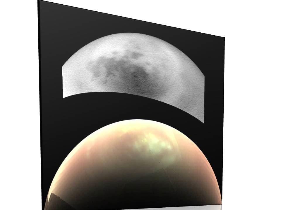▲같은 지점에서 타이탄을 대상으로 적외선 영역에 가까운 이미지(위쪽)로 찍은 사진에는 구름이 없고 더 긴 적외선 파장으로 촬영한 이미지(아랫쪽)에서는 구름이 선명하게 보인다.[사진제공=NASA]
