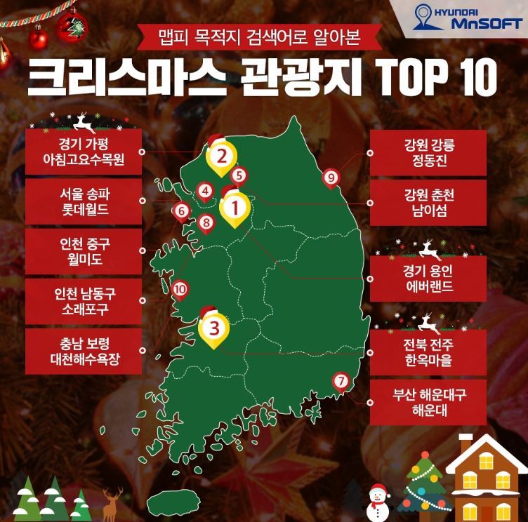 현대엠엔소프트가 빅데이터로 분석한 '크리스마스 명소 TOP10'을 공개했다.