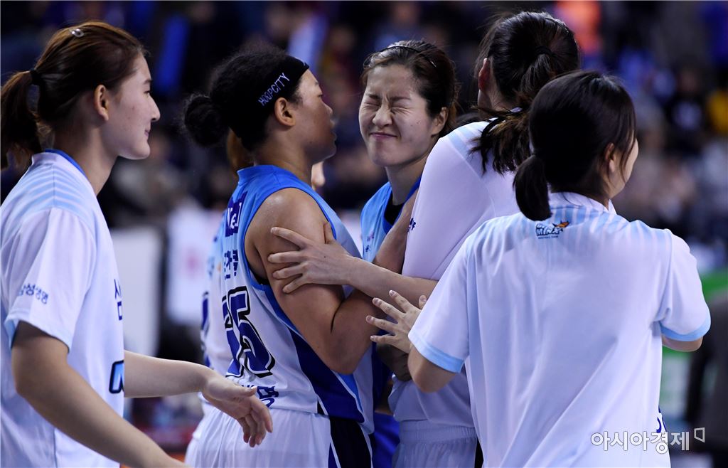 [용인=아시아경제 김현민 기자]여자프로농구 용인 삼성생명 블루밍스와 청주 KB국민은행 스타즈의 2016-2017 정규리그 경기가 26일 용인실내체육관에서 열렸다. 삼성생명 고아라가 팀의 75-70 승리를 확정한 뒤 동료들과 기뻐하고 있다. 김현민 기자 kimhyun81@asiae.co.kr<ⓒ세계를 보는 창 경제를 보는 눈, 아시아경제(www.asiae.co.kr) 무단전재 배포금지>