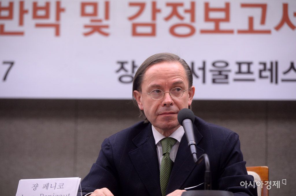 프랑스 감정업체 뤼미에르사의 장 페니코 소장이 미인도가 왜 위작인지에 대해 설명하고 있다. [사진=문호남 기자]