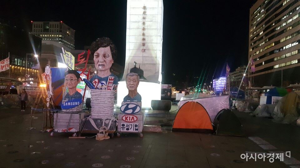 27일 오후 서울 광화문광장 이순신 동상 앞에 '블랙리스트' 명단에 오른 문화예술인들이 만든 박근혜 대통령 모형 옆으로 광화문캠핑촌의 텐트가 설치돼 있다.