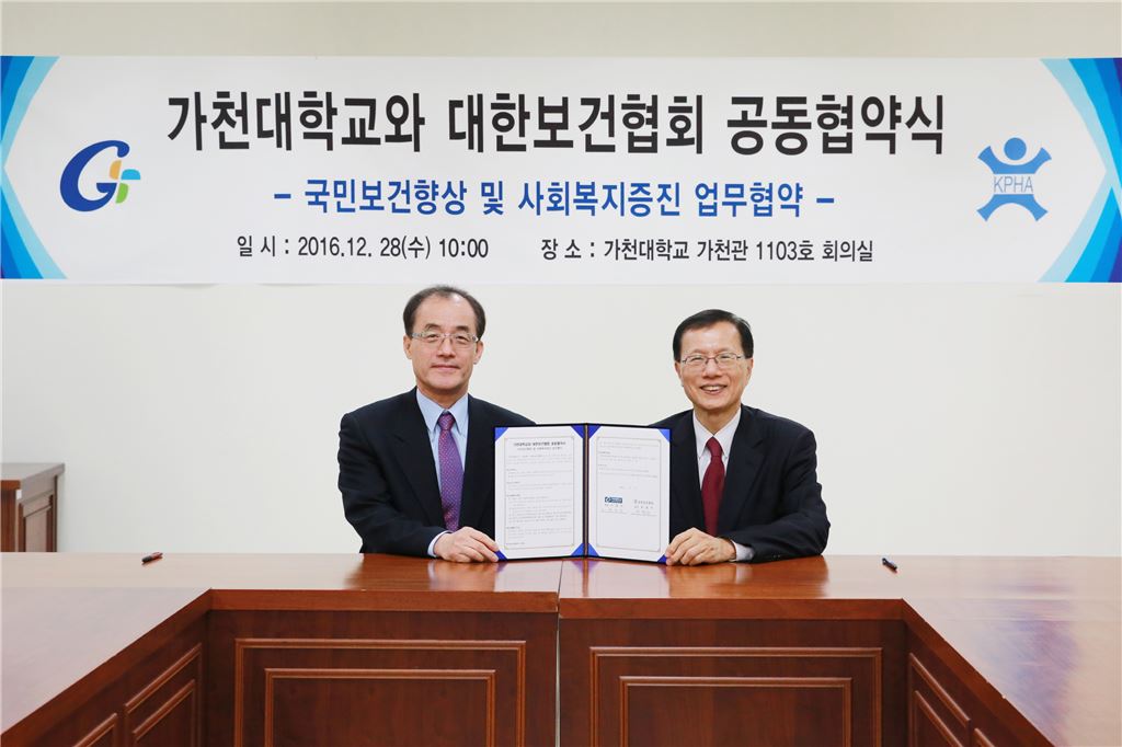 최도성 가천대 부총장(오른쪽)이 박병주 대한보건협회 회장과 국민건강 및 사회복지 증진을 위한 업무협약을 체결한 뒤 기념촬영을 하고 있다.