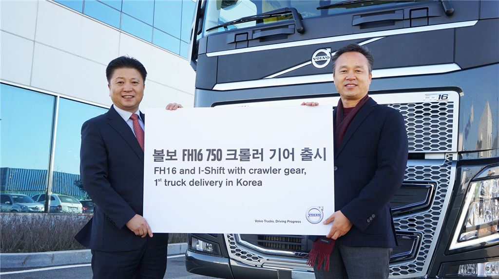 볼보트럭코리아는 27일 볼보트럭 평택종합출고센터에서 크롤러 기어가 장착된 I-쉬프트 자동변속기 1호차 인도식을 가졌다. 김영재 볼보트럭코리아 사장(왼쪽)과 차량을 구매한 정혁호 고객이 기념촬영을 하고 있다. <br />