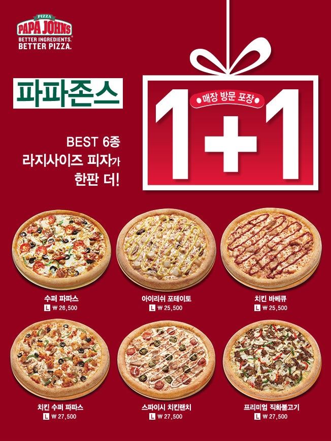 [아시아경제 오주연 기자]파파존스가 연말을 맞아 베스트 피자 6종 1+1 이벤트를 확대 실시한다고 29일 밝혔다.이번 이벤트는 기존 매주 금요일마다 했던 프로모션으로, 피자 한 판 가격에 두 판을 먹을 수 있는 것이 특징이다. 파파존스는 연말을 맞아 요일 지정 없이 오는 31일까지 1+1 이벤트를 실시하기로 했다. 이번 이벤트 해당 피자는 파파존스 판매 1위의 수퍼 파파스를 비롯해 아이리쉬 포테이토, 치킨 바베큐, 스파이시 치킨랜치, 치킨 수퍼 파파스, 프리미엄 직화불고기 등 6종이다. 파파존스 직영 매장에서 방문 포장할 시 적용받을 수 있으며, 교차 주문이 가능하다.오주연 기자 moon170@asiae.co.kr<ⓒ세계를 보는 창 경제를 보는 눈, 아시아경제(www.asiae.co.kr) 무단전재 배포금지>