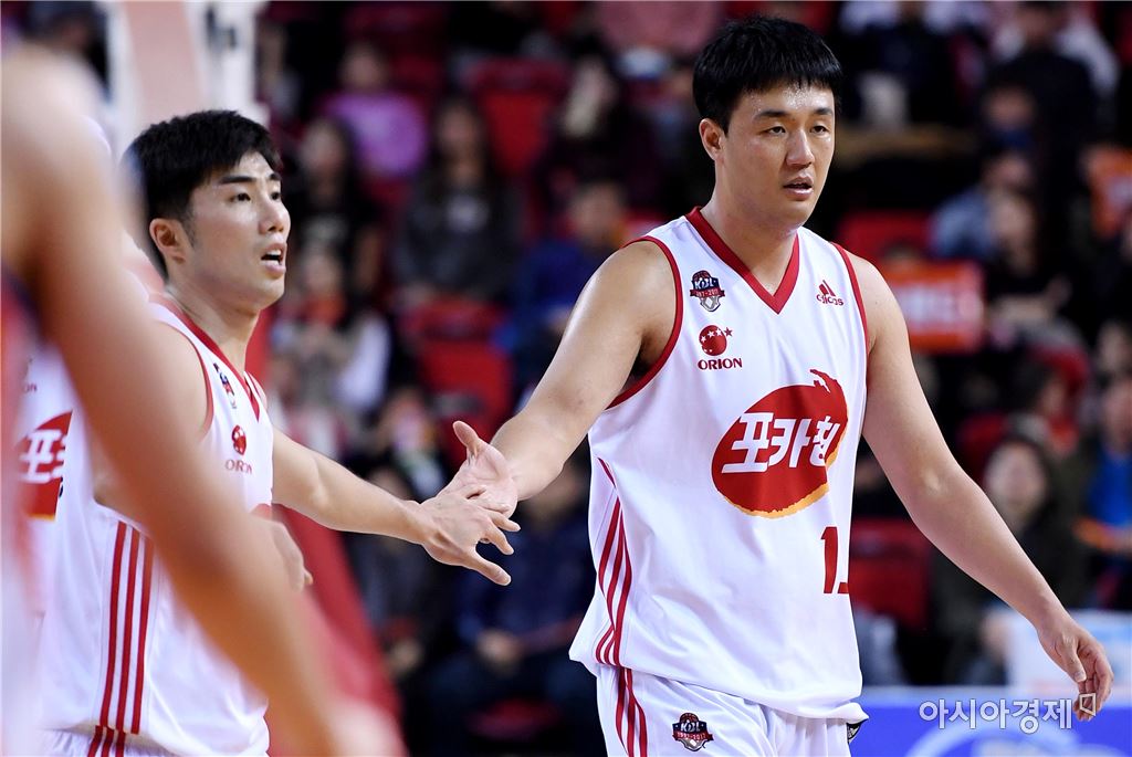 고양 오리온 오리온스 김동욱이 29일 인천삼산월드체육관에서 한 정규리그 원정경기에서 득점한 후 전재홍과 손바닥을 치고 있다 [사진=김현민 기자]