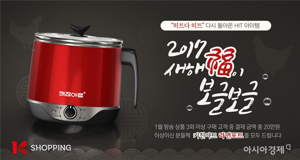 [아시아경제 김현정 기자] KTH가 운영하는 T커머스 K쇼핑이 새해를 맞아 특별 방송 및 사은 프로모션을 진행한다고 30일 밝혔다. 편성 제품은 인기 주방가전과 건강식품이다. 이와 더불어 TV앱을 통해 '2017년 새해 다짐 응원 기획전'을 론칭하는 등 다양한 상품과 혜택을 제공할 예정이다.다음달 5일 론칭하는 '코렐식기 세트(19P)'는 14만9000원에 선보인다. 방송 중 무이자 10개월 혜택과 함께 매 편성(1시간)마다 추첨을 통해 200명의 고객에게 도마 2종 및 실리콘조리기구 5종을 경품으로 증정한다. 1월11일 론칭 예정인 '테팔 프라이팬 세트'는 본 구성인 프라이팬 2종, 궁중팬 1종과 함께 방송에서만 특대편수전골 및 조리도구 4종을 추가로 증정하며 3만원 할인 혜택도 누릴 수 있다.건강식품으로는 '종근당 아이클리어 루테인 12박스(12개월분)'와 함께 K쇼핑 단독상품인 '한삼인 하루홍삼 4박스(4개월분)', '오색자연건강 흑마늘 진액 120팩' 등도 만나볼 수 있다.이와 함께 내년 1월 한 달 동안 '새해 복이 보글보글' 프로모션을 통해 방송상품을 3회 이상 구매한 고객 중 총 구매 금액이 20만원 이상인 모든 고객에게 '키친아트 멀티쿠커(라면포트)'를 사은품으로 증정한다. 사은품은 본품과 별도로 2월14일부터 순차 배송된다.방송 이외에도 고객들이 간단한 리모컨 조작으로 쇼핑할 수 있는 K쇼핑 TV앱에서는 오는 31일부터 '2017년 새해 다짐 응원 기획전'을 론칭한다. 헬스전문브랜드 '렉스파'에서 선보이는 '헬스자전거 제로바이크 YA-150'과 '가정용 거꾸리 YA-740', 부위별로 다양한 근력운동 및 스트레칭을 할 수 있는 '식스팩파워 YA-670N 복근운동기구' 등을 만나볼 수 있다.지친 눈의 피로를 풀어줄 '천연옥 원적외선 눈 마사지기(JTM-01)'을 기존가 대비 30% 할인된 3만5000원에, 수면 모니터링부터 스포츠 시계로까지 활용 가능한 '제로너 A+ 스마트밴드'를 기존가에서 30% 할인된 3만2000원에 판매할 예정이다.김현정 기자 alphag@asiae.co.kr<ⓒ세계를 보는 창 경제를 보는 눈, 아시아경제(www.asiae.co.kr) 무단전재 배포금지>
