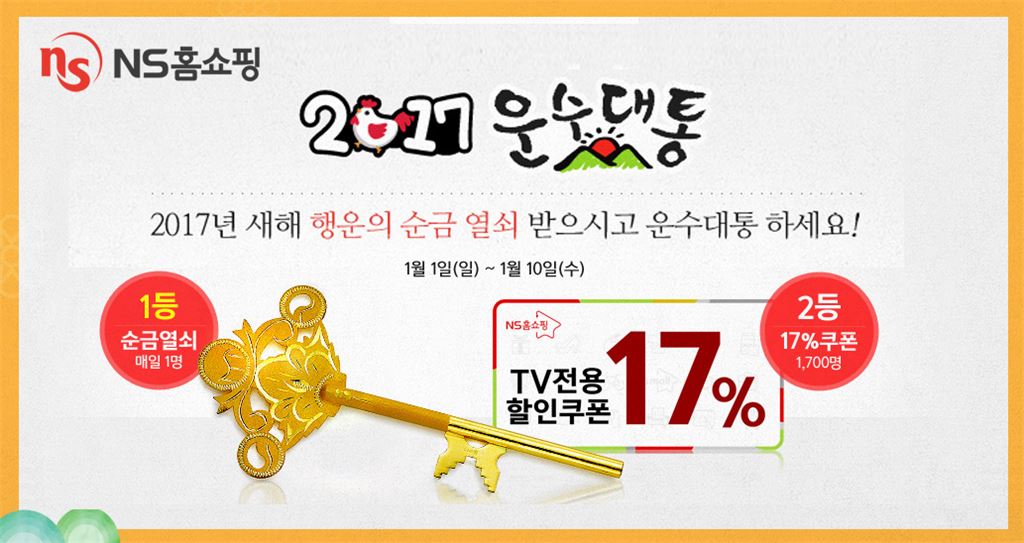 [아시아경제 조호윤 기자]NS홈쇼핑은 내년 1월1일부터 10일까지 신년특집 ‘2017 운수대통’을 진행한다고 30일 밝혔다. 2017 운수대통은 NS홈쇼핑(TV), NS몰, NS모바일, NS쇼핑북에서 3만원이상 상품 1건 이상 구매한 고객을 대상으로 추첨을 통해 순금열쇠(5돈)를 총10명에게 주고, TV상품 전용 17% 할인쿠폰을 1700명에 증정하는 행사다. 총 10일 동안 매일 1명씩을 추첨하며 총 10명에게 순금열쇠(5돈)의 행운이 돌아간다. 순금열쇠 및 17%쿠폰 당첨자는 내년 2월2일 오후 3시 이후 NS몰 이벤트 게시판을 통해 확인 할 수 있고, 17% 할인쿠폰은 2월6일 당첨자에게 자동 부여 된다. 순금열쇠 상품의 제세공과금(22%)은 당첨자 부담이며, 17%할인 쿠폰은 TV 방송 상품 판매가 5만원 이상 상품이면 모두 적용할 수 있다. 최대 할인금액은 3만원이며, 사용 기간은 내년 2월6일부터 19일까지이다. 단, 구매건 취소, 반품시 당첨 취소될 수 있고, 중복 당첨은 불가하다. NS홈쇼핑은 행사 기간동안 신년 맞이 상품들을 대거 편성했다. 내년 1월2일 10시25분에는 우리 가족 건강지킴이 ‘정관장 홍삼활력플러스’를 3일 오전 9시20분에는 집에서도 간편하게 머리 손질이 가능한 주부들의 셀프 헤어 관리 상품 ‘셀프뿌리퍼머’, 7일 12시50분에는 ‘여에스더유산균’을 방송한다. 조호윤 기자 hodoo@asiae.co.kr<ⓒ세계를 보는 창 경제를 보는 눈, 아시아경제(www.asiae.co.kr) 무단전재 배포금지>