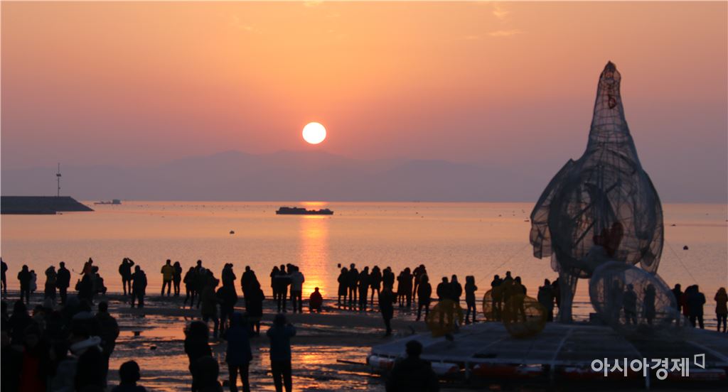 "해맞이 관광명소 득량만, 보성율포솔밭해변에서" [아시아경제 노해섭 기자] 해맞이 관광명소인 보성군 득량만 율포솔밭해변에 2만여명의 인파 몰렸다. 1일 전남 보성 득량만 해돋이 명소에 관광객이 새해 떠오르는 정유년(丁酉年)의 첫 해를 맞이하며 소망을 빌었다.이곳 율포솔밭해변 수상에는 닭띠해인 정유년 “희망의 아침”이란 낭만적인 조형물(닭의 형상)이 설치되어 있다.노해섭 기자 nogary@<ⓒ세계를 보는 창 경제를 보는 눈, 아시아경제(www.asiae.co.kr) 무단전재 배포금지>