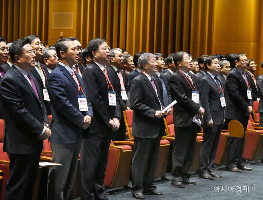 ▲2일 오전 서울 영등포구 LG 트윈타워에서 열린 LG그룹 시무식에서 구본무 LG 회장을 비롯한 주요 경영진이 새로운 도약을 위한 의지를 다지고 있다.(제공=LG)