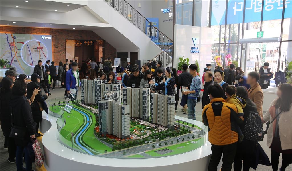 지난 9일 문을 연 '울산 송정 한라비발디 캠퍼스' 견본주택 내부가 방문객들로 붐비고 있다.(자료:한라)