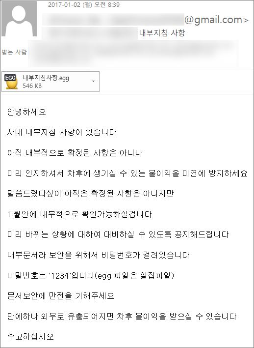 [아시아경제 박소연 기자]이스트소프트는 2일 국내 주요 국가 기관과 기업을 대상으로 한 랜섬웨어가 다량 유포되고 있다며, 사용자의 각별한 주의와 보안 강화를 당부했다.이스트소프트 시큐리티대응센터에 따르면 이번 랜섬웨어는 악성파일을 첨부한 이메일을 국가 기관과 기업 종사자에게 다량 발송하는 형태로 유포됐다. 특히 발송된 이메일에는 사내 내부지침 사항을 공유한다는 안내와 함께 ‘내부지침사항.egg’라는 이름의 압축파일을 첨부하고 있어, 조직 개편 등 신년을 맞아 각 기관과 기업의 내부 변동 사항이 많은 시점을 노려 첨부파일 열람을 유도한 것으로 분석된다.첨부된 파일을 압축 해제하면 ‘외부공문.doc’라는 이름의 문서로 위장한 실행 파일(*.exe)과 ‘내부지침사항.doc.lnk’ 윈도우 바로가기 파일(*.lnk)이 나타나며, 바로가기 파일을 클릭하면 문서 파일로 위장된 실행파일이 작동하며 사용자 PC를 랜섬웨어에 감염시킨다.회사 측은 이번 랜섬웨어는 비너스락커(Venus Locker) 변종이며, 일반적인 랜섬웨어와 같이 PC에 저장된 주요 문서를 암호화하고 특정사이트로 접속을 유도해 비트코인을 요구한다고 설명했다.김준섭 이스트소프트 보안사업본부장은 “중요한 문서를 다루는 국가 기관과 기업 종사자를 특정해 공격한 이번 사례와 같이, 랜섬웨어를 활용한 사이버 공격 방식이 갈수록 지능화되고 있다”며, “기관 및 기업 관계자가 랜섬웨어에 감염될 경우 국가 기밀, 기업 정보 등이 유출 또는 유실되는 큰 피해가 발생될 수 있기 때문에, 더욱 세심한 주의가 필요하다”고 당부했다. 박소연 기자 muse@asiae.co.kr<ⓒ세계를 보는 창 경제를 보는 눈, 아시아경제(www.asiae.co.kr) 무단전재 배포금지>
