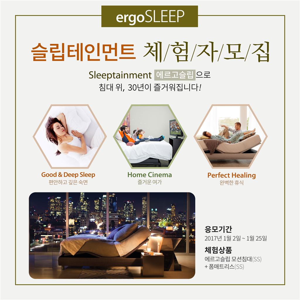 [아시아경제 임온유 기자] 침대 전문 멀티스토어 에르고슬립이 최대 600만원 상당의 모션베드와 폼 매트리스를 제공하는 슬립테인먼트 체험 이벤트를 실시한다고 3일 밝혔다.슬립테인먼트(Sleeptainment)는 ‘잠을 자다(Sleep)’와 ‘여가(Entertainment)’의 합성어로, 맞춤 침대로 숙면은 물론 영화감상, 독서 및 마사지 테라피 등 엔터테인먼트 기능을 부가한 새로운 침실문화를 의미한다. 에르고슬립 슬립테인먼트 체험 이벤트는 오는 25일까지 리뷰 전문기업 웨이워즈 블로그를 통해 응모할 수 있다. 당첨자는 내달 3일 공개된다. 참여 방법은 에르고슬립 홈페이지에서 미세 각도 조절, Zero-G 모드, 미세 진동마사지 등 모션베드의 다양한 기능 중 가장 체험하고 싶은 부분과 원하는 종류의 매트리스 이미지를 캡쳐하고, 자신의 블로그에 응모 사유와 함께 업로드 하면 된다. 선정된 체험자 1인에게는 에르고모션의 모션베드 S600과 자신이 선정한 폼 매트리스를 제공하며, 당첨되지 못한 참가자들에게도 스트레스프리 리클라이너(1명), 천연 라텍스 베개(5명), 카프라노 커피메이커(5명), 스타벅스 아메리카노 기프티콘(50명) 등 푸짐한 경품이 증정된다. 모션베드 S600 시리즈는 글로벌 모션베드 전문 브랜드 에르고모션사의 최상위 모델로 숙면뿐 아니라 독서, TV시청 등의 활동 시 미세 각도 조절로 가장 편안한 자세로 휴식을 취할 수 있다. 리모컨 원터치로 무중력 상태(Zero-gravity) 포지션 전환이 가능하며 수면유도 마사지, 릴랙스 모드 등 다양한 힐링 기능이 포함되어 있다. 한편, 에르고슬립 논현 플래그십 스토어에서는 슬립 피팅 시스템(Sleep Fitting System)을 도입해 개인의 신체적 특성에 맞는 최적의 매트리스를 선택할 수 있도록 돕고 있다. 방문객의 보다 자유롭고 편안한 체험을 위해, 독립된 체험공간인 슬립테인먼트존(Sleeptainment Zone)을 열어 호응을 얻고 있다.임온유 기자 ioy@asiae.co.kr<ⓒ세계를 보는 창 경제를 보는 눈, 아시아경제(www.asiae.co.kr) 무단전재 배포금지>