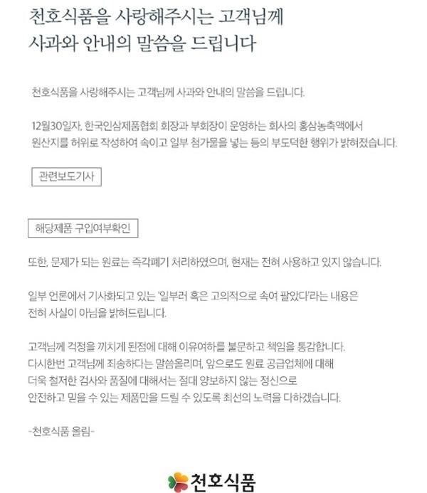 [아시아경제 이주현 기자]'가짜 홍삼액'을 판매한 혐의를 받고 있는 천호식품이 사과문을 게재했다.천호식품은 3일 홈페이지에 "사과와 안내의 말씀을 드린다"는 제목의 사과문을 올렸다. 천호식품은 해당 글에서 "12월 30일자, 한국인삼제품협회 회장과 부회장이 운영하는 회사의 홍삼농축액에서 원산지를 허위로 작성하며 속이고 일부 첨가물을 넣는 등의 부도덕한 행위가 밝혀졌다"고 말했다.천호식품은 "홍삼농축액이 입고될 때마다 홍삼의 유효성분인 진세노사이드 함량을 철저하게 검사해 기준치에 적합한 원료만 제품에 사용했다"며 "업체에서 당성분을 의도적으로 높이는 물질을 미세량 혼입하는 경우에는 육안검사와 성분검사로 확인이 불가능하다"고 해명했다. 이어 "'일부러 혹은 고의적으로 속여 팔았다'는 내용은 전혀 사실이 아니다"면서 "원료 공급 업체에 대해 더욱 철저한 검사를 하겠다"고 밝혔다.
