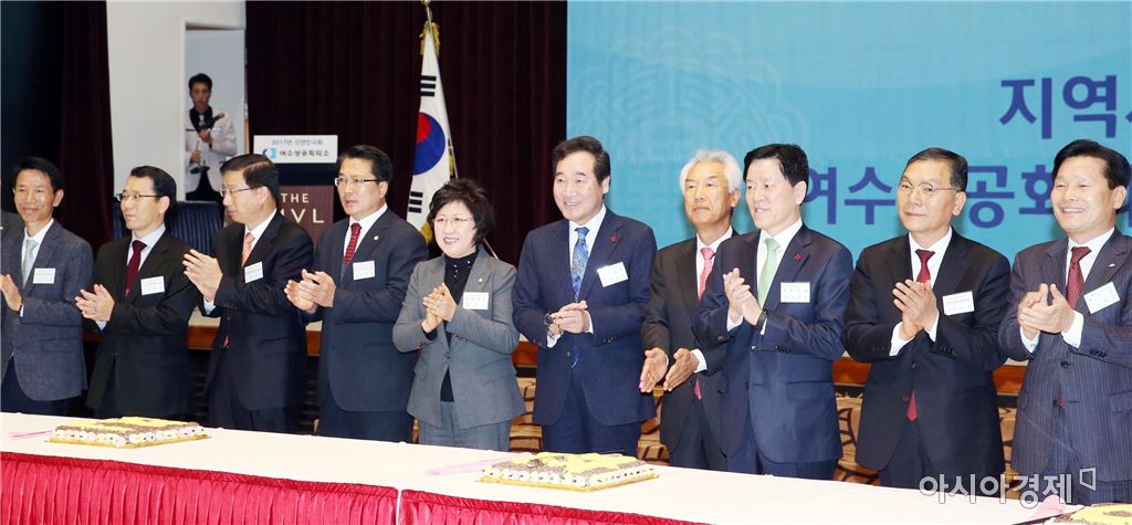 2017 여수상공회의소 신년인사회가 3일 오전 여수 엠블호텔에서 열린 가운데 최도자 국회의원, 이낙연 전남지사, 박용하 여수상공회소 회장, 주승용 국회의원(왼쪽부터)이 시루떡을 자르고 있다.